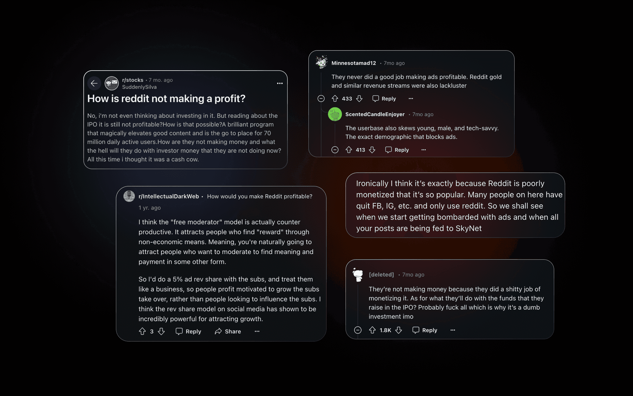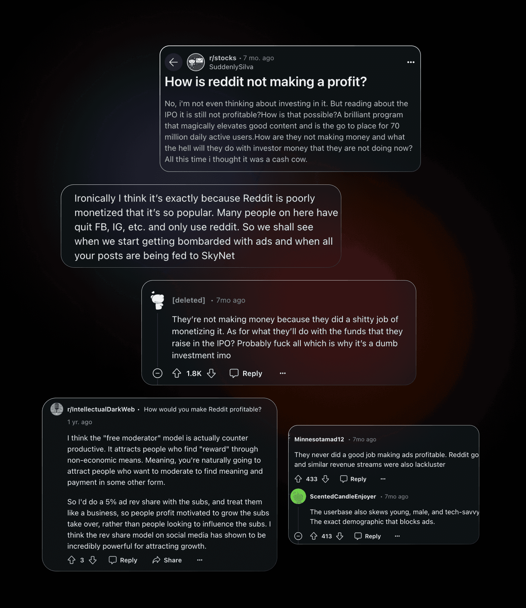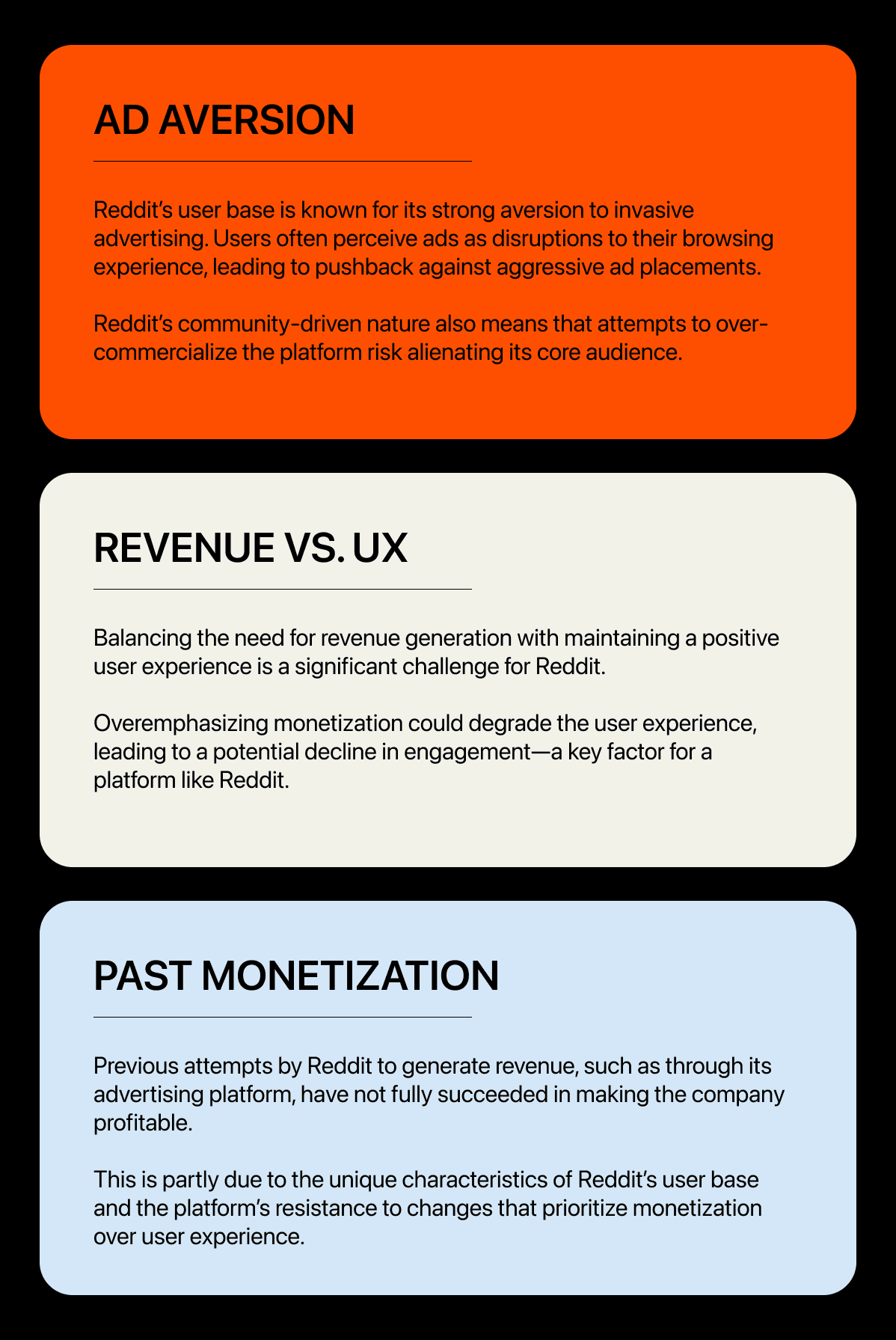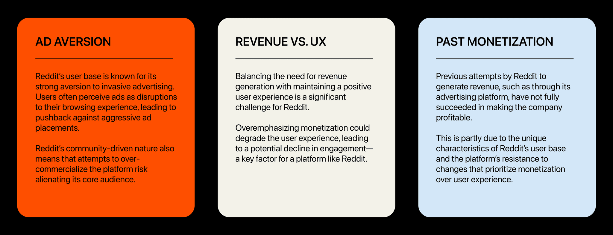 Problem Statement: While Reddit's user base is vast and highly engaged, the company has posted substantial cumulative losses—more than $700 million over the years. Reddit's IPO prospectus outlined strategies to increase profitability, such as ramping up advertising revenues and licensing user-generated content. However, these efforts may not fully align with the unique characteristics of Reddit’s user base, making traditional monetization strategies less effective. This case study aims to explore how Reddit can become profitable without alienating its core users.